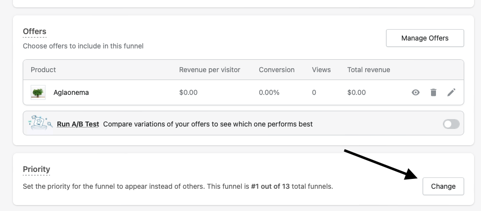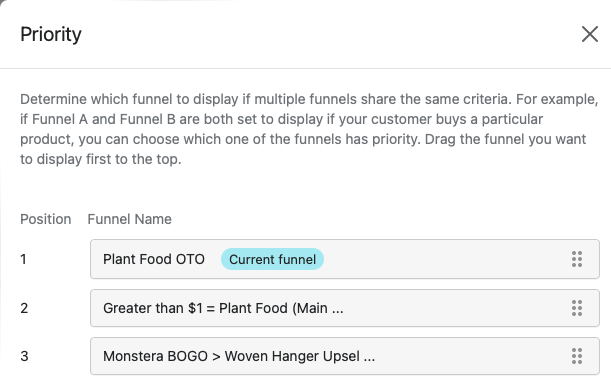 Setting priority also lets you choose which funnel to display if multiple funnels share the same criteria. For example, if your customer buys a particular product, you can choose which funnel has priority if Funnel A and Funnel B are both set to display. Click on any funnel, scroll to the bottom to the Priority section, then click "Change."