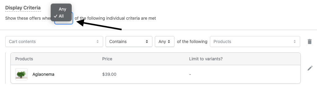 If you want your offers to display only when ALL criteria are met, you'll need to set it to ALL in the settings. If you want your offers to display when ANY of the chosen criteria are met, set it to ANY.