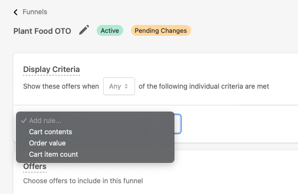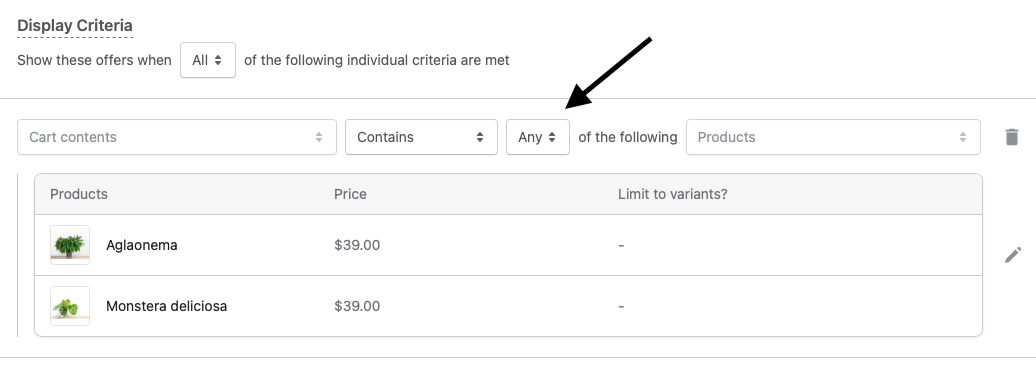 In the screenshot above, you’ll see we’ve selected ANY. When this is the selected criteria, your offers will display when ANY of the products are added to the cart. That option can also be set to ALL, requiring ALL of the products to be purchased for the funnel to trigger.