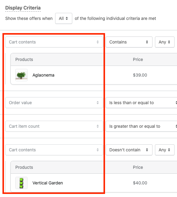 If you want your offers to display only when ALL criteria are met, you'll need to set it to ALL in the settings. If you want your offers to display when ANY of the chosen criteria are met, set it to ANY.