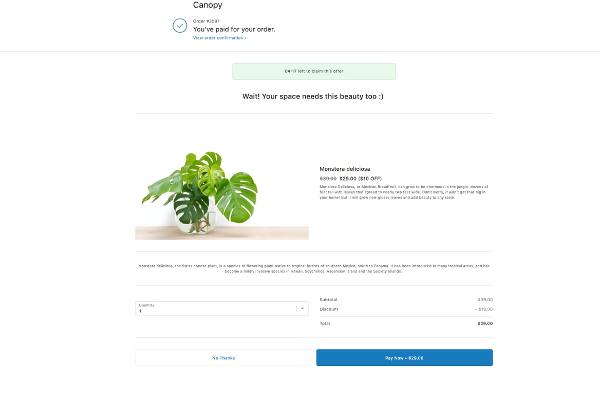 Once that’s done, the customer will be displayed up to two post purchase offers. They’ll also be shown a confirmation that they’ve paid for their original order.Â
