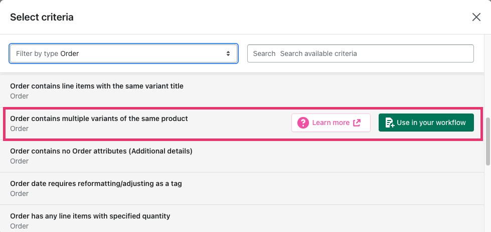 The Order contains multiple variants of the same product criteria can be found within the Order category in the Select criteria pop-up window: