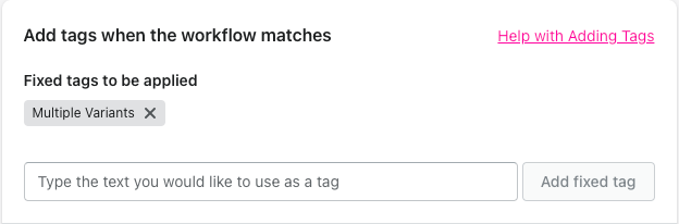 Choose the name of the tag you'd like to see on all orders that match this workflow and enter it into the Add tags when the workflow matches section.