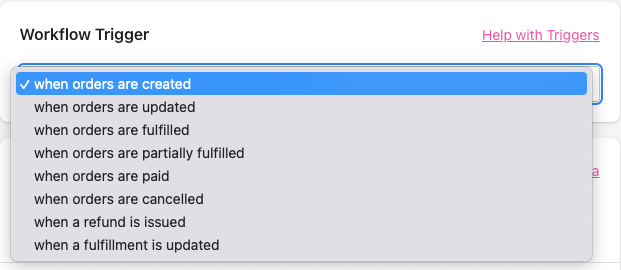 Define the trigger to determine at which point you would like the workflow to run, we recommend selecting the trigger when orders are created.