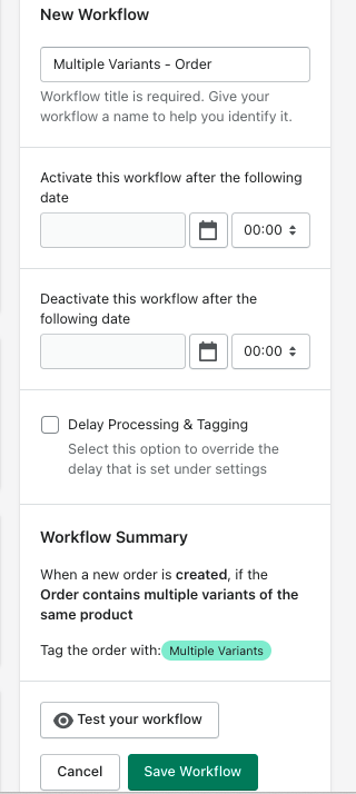 It's worth giving your workflow a name to help you identify it at a later date, so add a workflow name in the New Workflow section, check the summary of your workflow and if happy, either Test your Workflow against an existing order or hit Save Workflow: